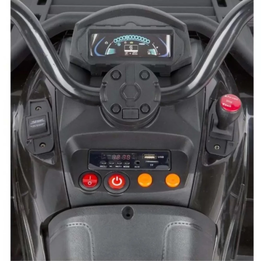 Чтобы по вечерам ездить было безопаснее, на модели установлены мощные светоотражатели. Ограничитель скорости ограничивает максимальную скорость квадроцикла в настройках, чтобы езда была ещё безопаснее. За максимальную скорость в 12 км/ч отвечает полноприводный движок 4х45W.