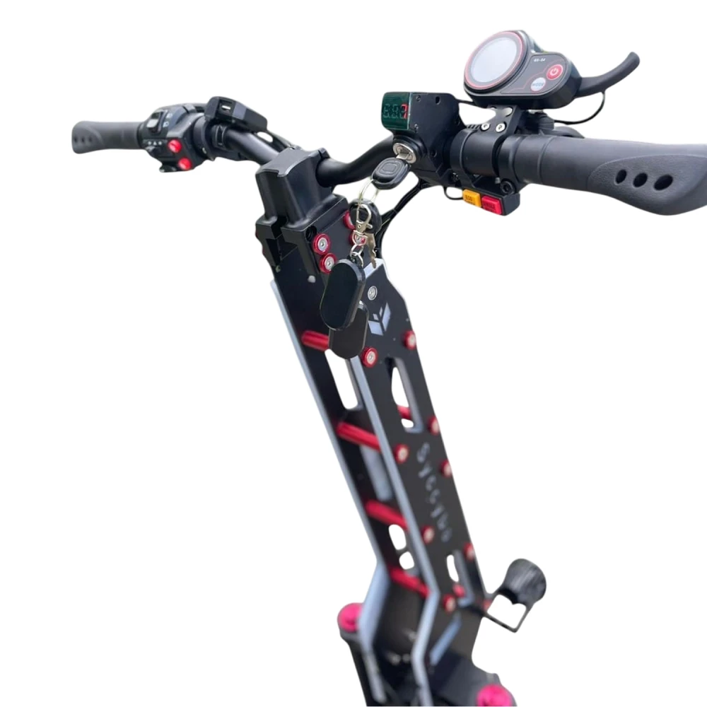 Электросамокат Syccyba Goliaf — полноприводный внедорожник премиум-класса с пиковой мощностью 11000 Вт, максимальной скоростью 110 км/ч, пробегом до 100 км и грузоподъемностью до 150 кг, предназначенный для экстремальной езды по бездорожью.​​